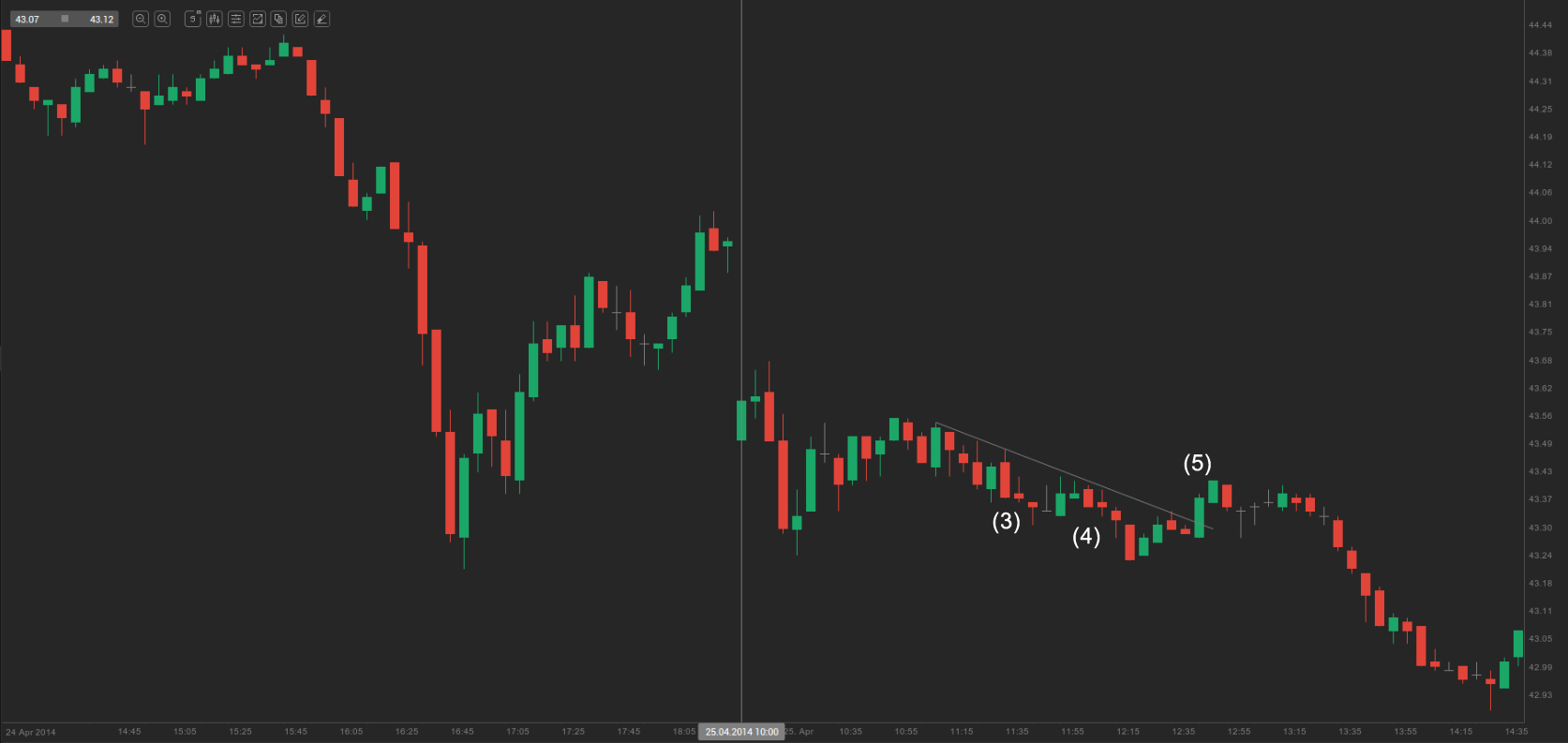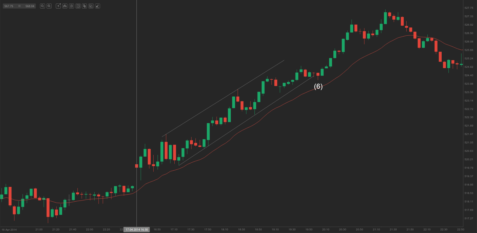On the 5-minute chart of Société Générale (GLE), bars 3 and 4 were tiny pullbacks that failed to breach a key bear trend line. The first pullback to break this line was bar 5. The first breach of a trend line often leads to another leg in the trend and therefore provides a good opportunity to enter the market. In this case, going short below the low of bar 5 would have been a profitable trade. Very often, unclear pullbacks imply that traders opposing the trend are weak, although determining which pullback is the first meaningful one is not easy.