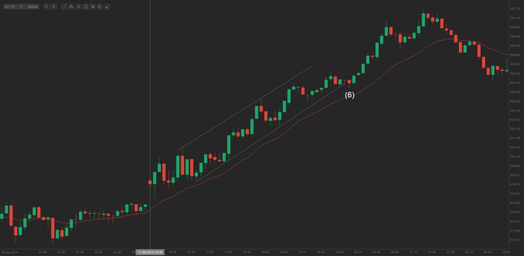 On the 5-minute chart of AAPL above, we can see that the market began a strong uptrend at the start of the trading day. There was a bull channel and a breach of the bull trend line at bar 6, which constituted the first pullback in the trend. Traders probably went long on a stop a few ticks above the high of bar 6, even though it was a weak signal (a bearish close, yet still above the midpoint of the bar). More aggressive traders may have placed a limit order at the low of the bar preceding bar 6, expecting a failed breakout below the bull trend line and a move to higher price levels.