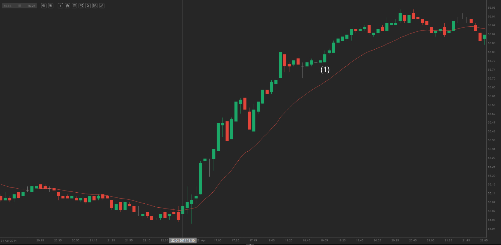 On the 5-minute chart of J.P. Morgan Chase (JPM) we can see that the market entered an uptrend from the start of the day, characterised by small pullbacks. If all pullbacks are less than 25% of the recent average daily range, the trading day is classed as a small-pullback day. Any sideways move was a pause – and therefore a type of pullback – and a setup to go long. The breakout at bar 1 from the two-legged sideways correction was a good entry.