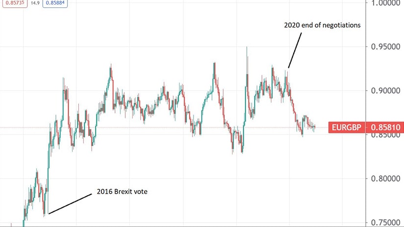 The EURGBP cross started the referendum day close to 0.75 and quickly jumped higher as investors sold the British pound. Four years of negotiations led to a long-term consolidation between 0.85 and 0.95, with many investors waiting for the cross to reach parity.