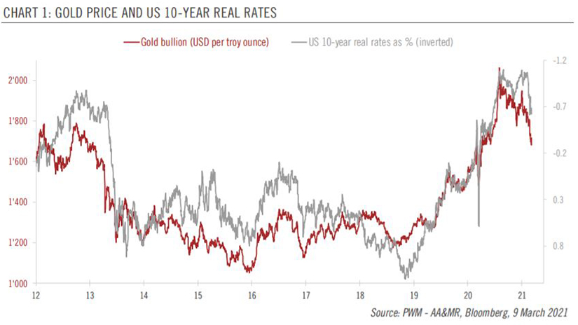 The explanation comes from the inverse relationship between the price of gold and the 10-year real rates. This is an inverse correlation, but quite a tight one, if we consider that the chart above shows the two assets’ correlation over the last decade.