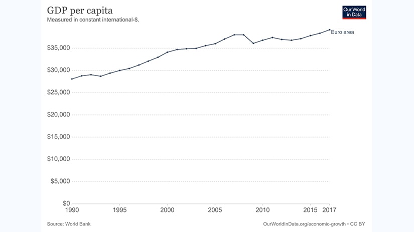 But since its introduction, the Gross Domestic Product (GDP) per capita in the Euro area is constantly growing. In other words, the euro fostered growth and competitiveness, quickly becoming the pillar the European Union is built upon.