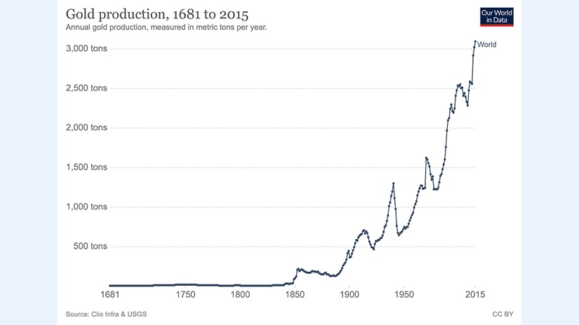 Gold production increased significantly since 1850, but the price of gold has traditionally kept pace with the rise in inflation. Inflation is triggered by an increase in the money supply, or M2, in an economy, and gold follows the money supply closely.