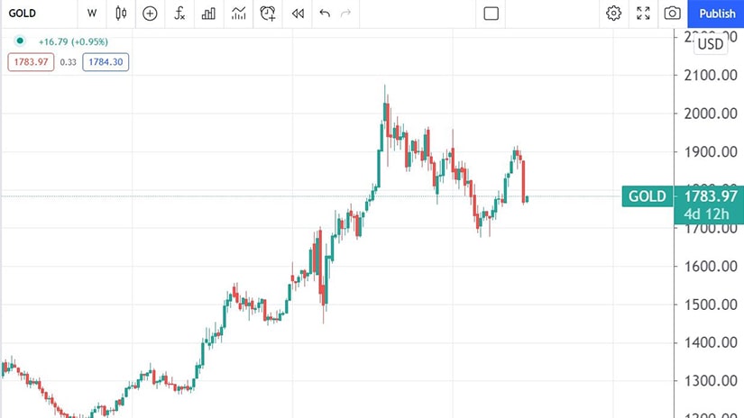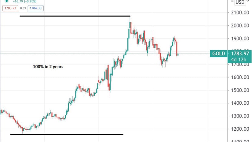 Hello there, this is tradingpedia.com and in this video we talk about gold or XAUUSD. Gold can be denominated in various currencies but usually it is in USD. It is offered by many brokers and gold recently made a new high, well above the $2,000. This was the previous top, then the market dipped lower, it consolidated for a long time before exploding to a new all-time high during the coronavirus crisis.