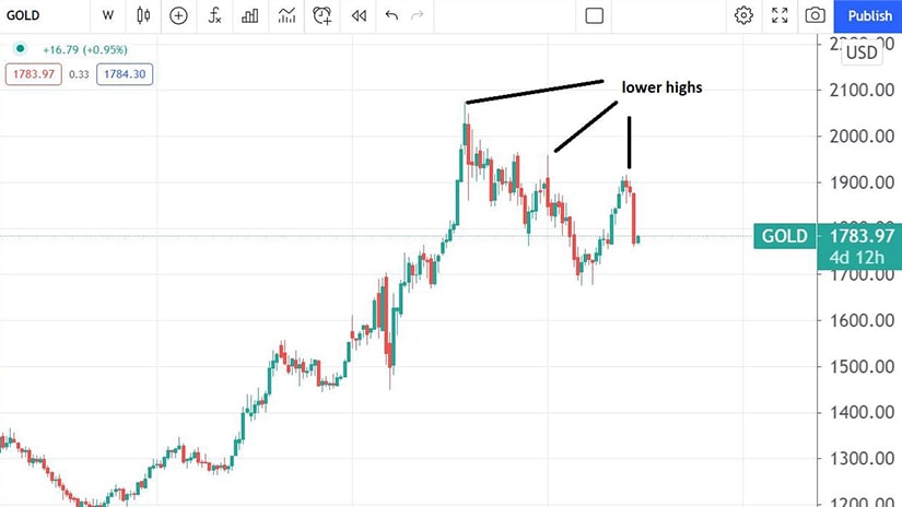 A quick look at the chart above shows that the drop during the 2020 pandemic from $1,700 to $1,500 was not even strong enough to break the higher lows series. Such a series defines a bullish trend, and the market’s correction was not enough to invalidate the trend.