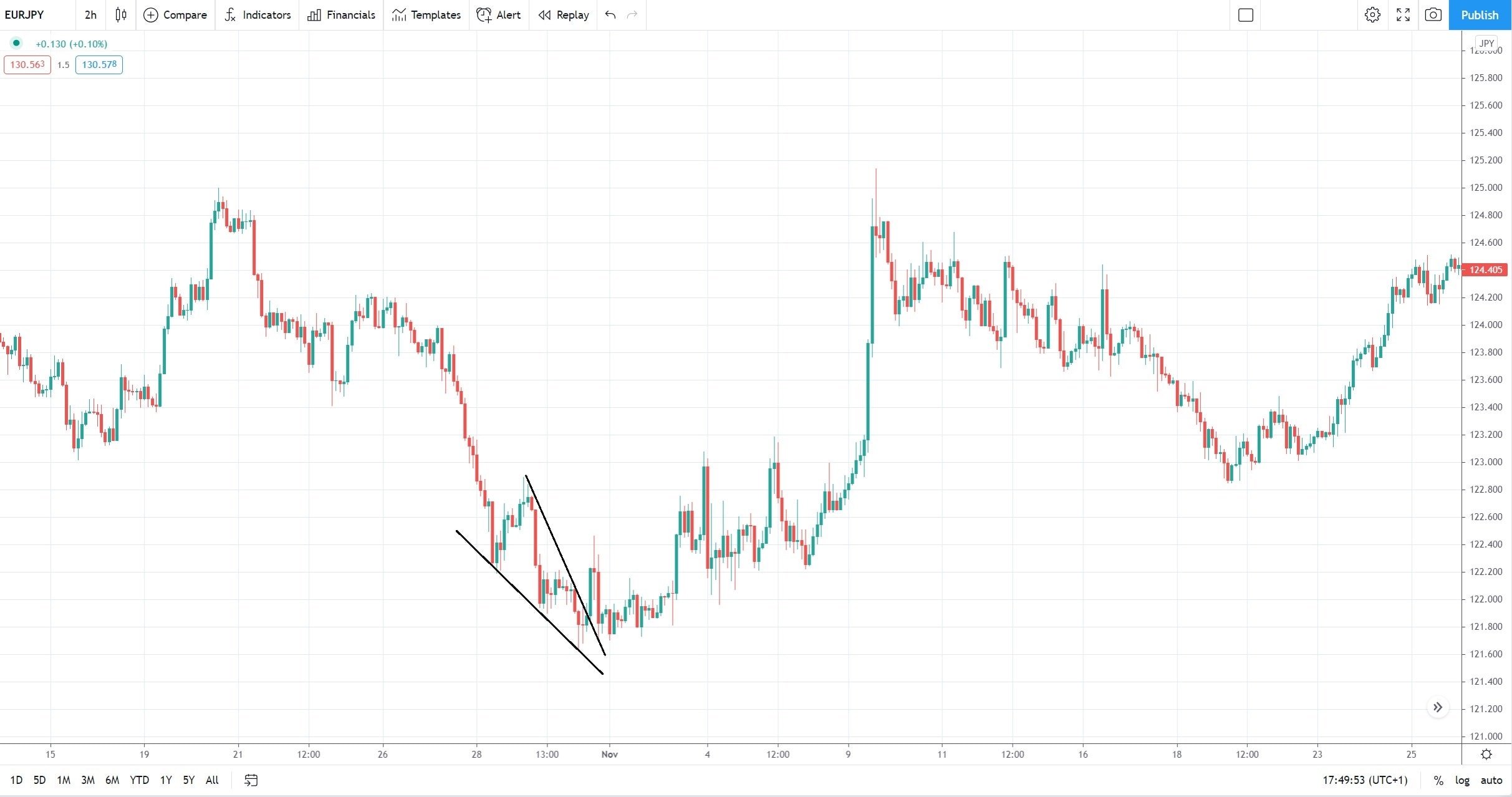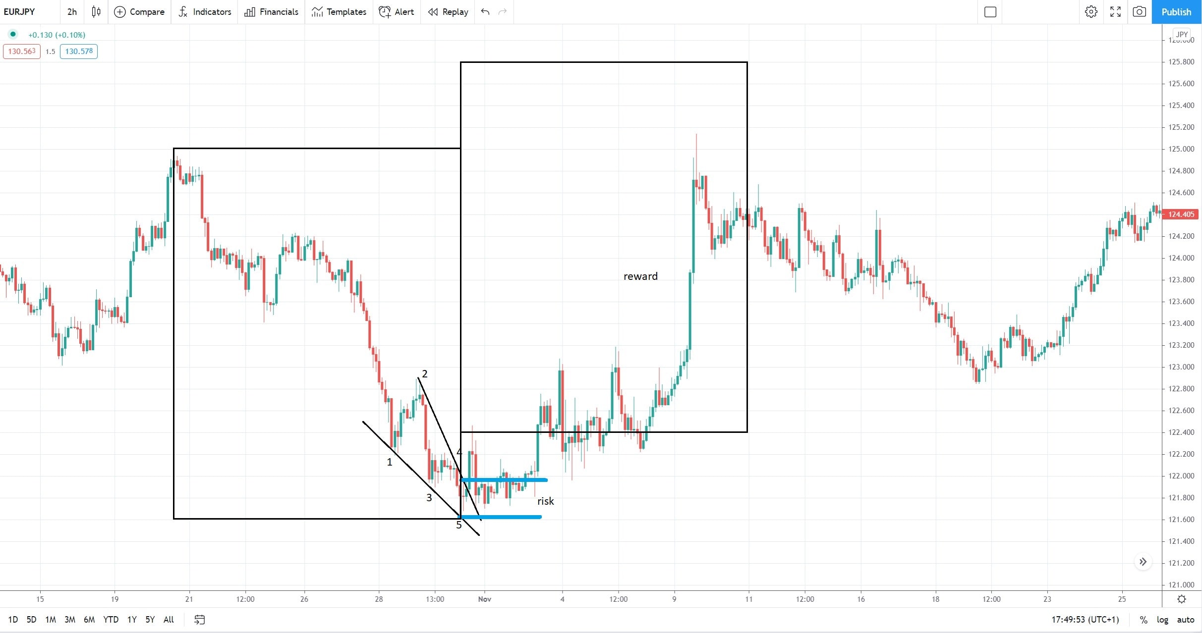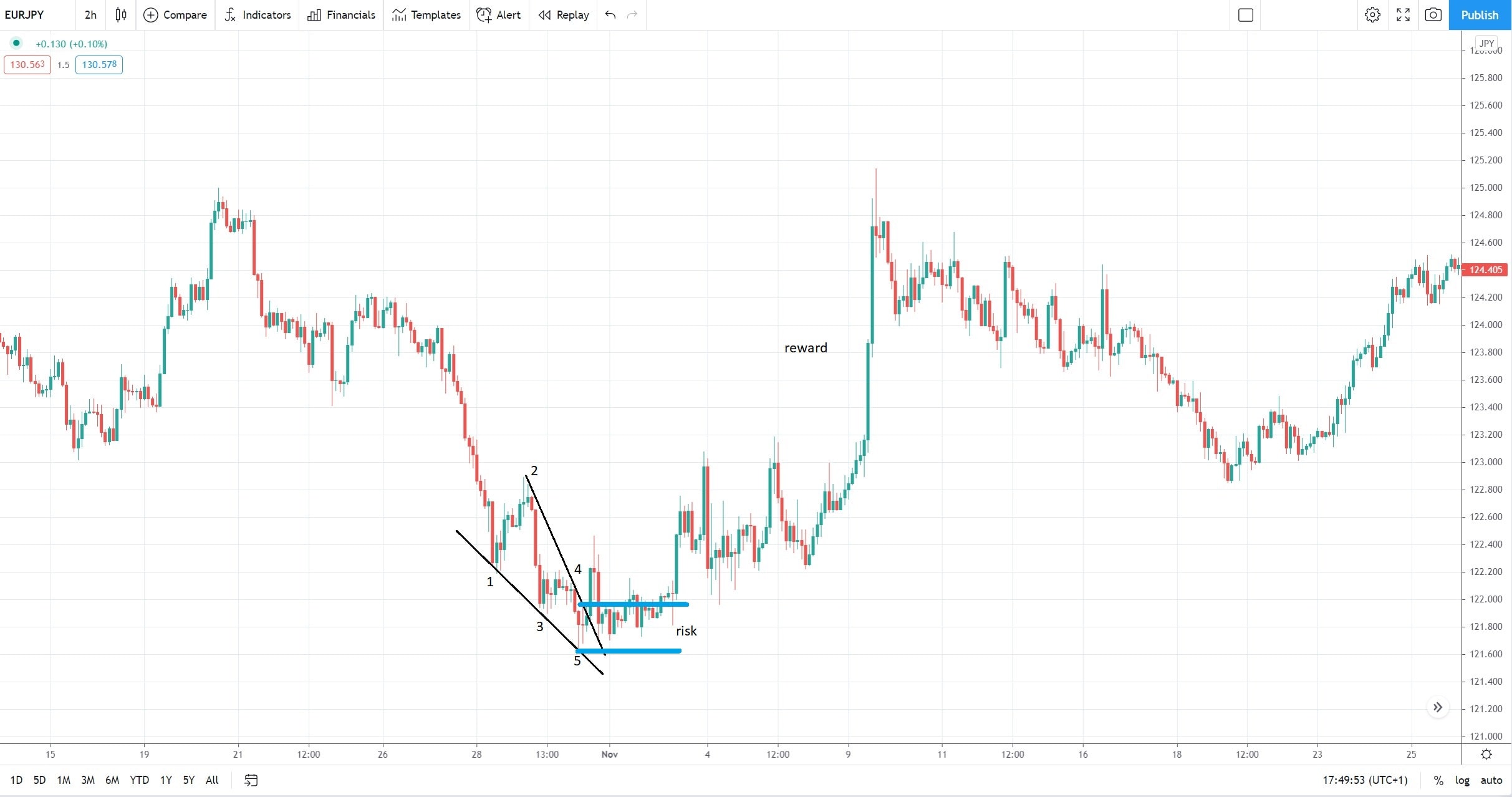 This is an example of a rising wedge, but on this chart, we see an example of a falling wedge. If we apply the same principles as discussed here, we see that the market, when dropping from 1.24 to 1.19, it formed a series of marginal lows and lower highs. If we connect these one – imagine five points here – we see that the fifth segment pierces the 1-3 trendline is a good sign that you want to see. The entry on the long side comes by the time that the price breaks the upper edge of the falling wedge and the stop-loss is mandatory to be at the lows.
