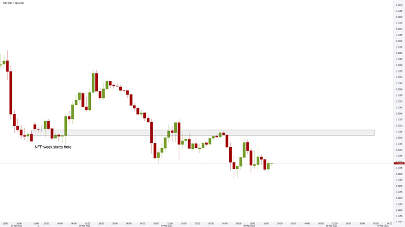 Have a look at the EURUSD price action prior to the May 2021 NFP report. The horizontal area shows the level where the market opened on Monday and where the market was less than two days ahead of the release.