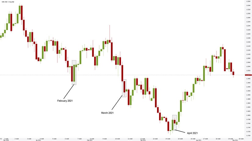 If the Monday candlestick closes in the same direction as the Friday one, the chances are that the main trend remains intact. On the other hand, if Monday’s candlestick reverses the price action seen on Friday, the chances are that the trend reverses too.