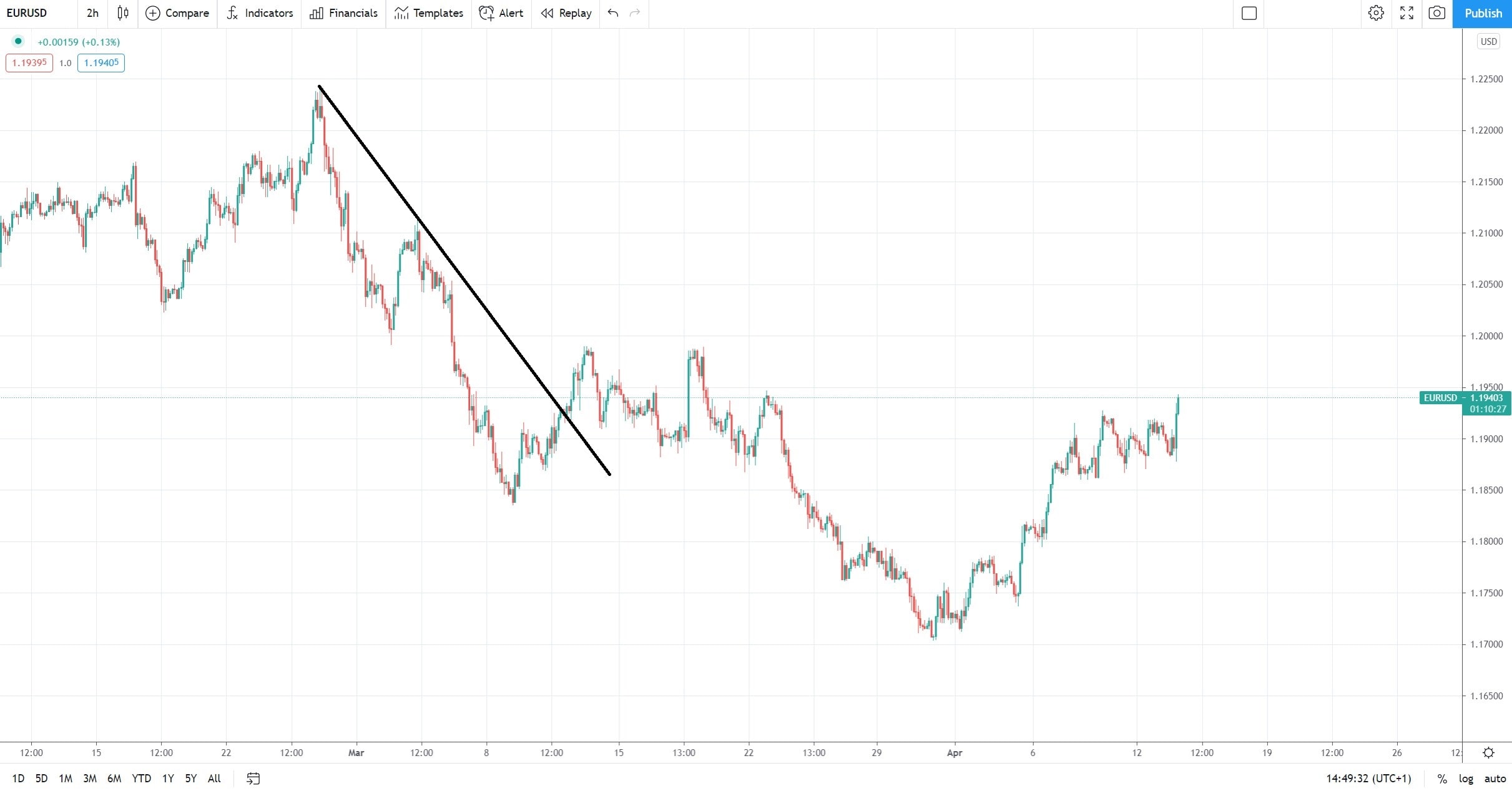 A trendline is the line of the trend, so the first thing to do is to make sure it is drawn correctly. In a bearish trend, the trendline must start from the highest point in the previous bullish trend and connect the first lower high. By projecting it on the right side of the chart, traders obtain the line of the trend.