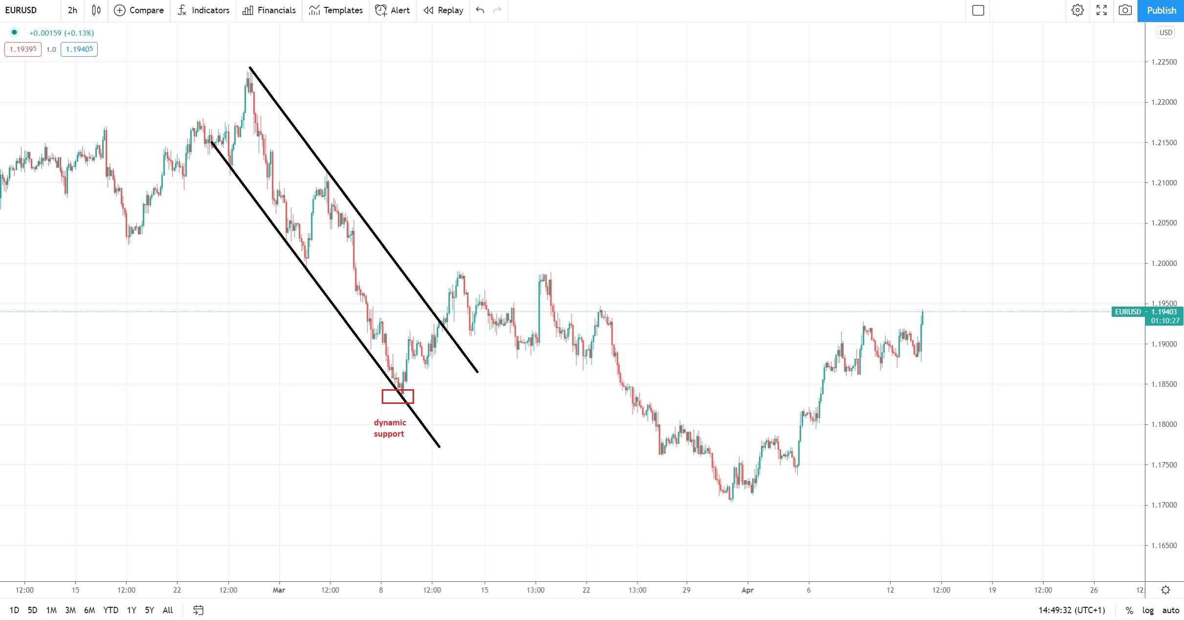 By projecting a bearish trending from the first lower low in the series, traders can build a so-called bearish channel. When the price meets the opposite side of the channel, it meets dynamic support.