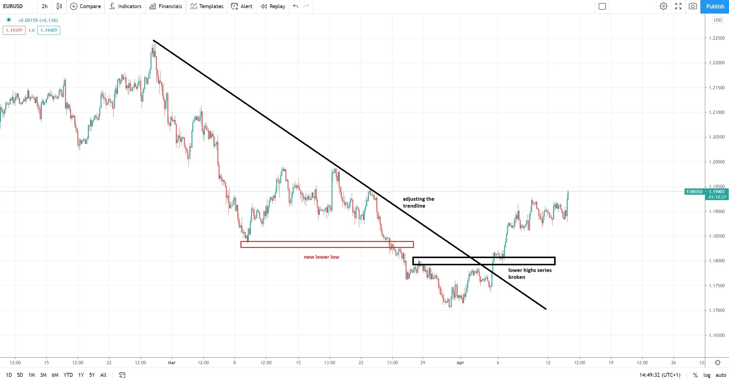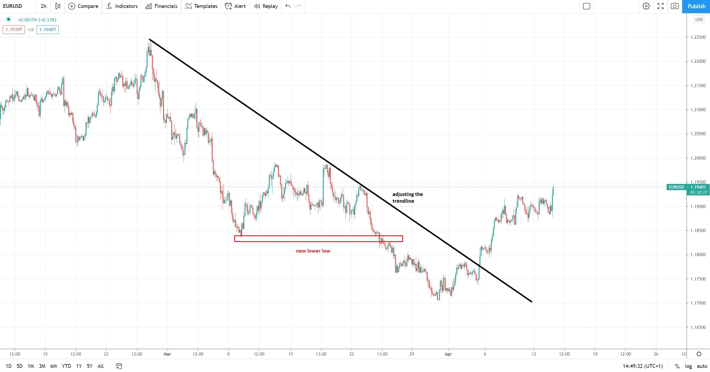 Therefore, the only thing that remains is to adjust the original trendline to the new market conditions. Adjusting is done after the market forms a new lower low and the trendline now connects the original high to the new lower high.