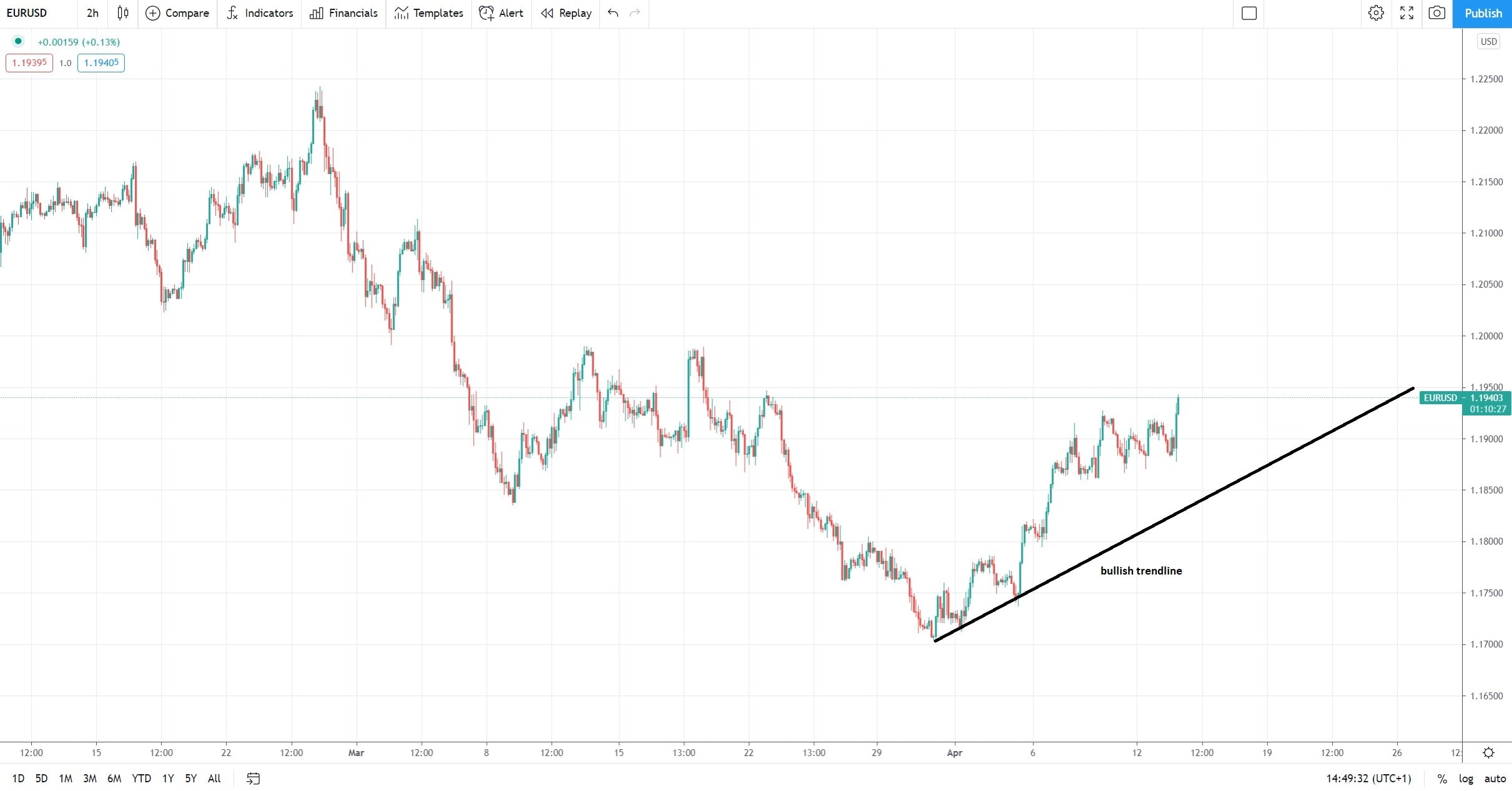 To do so, we must follow all the previous steps and apply them to a bullish trend. First, we need to identify the lowest point in the previous trend – this is where the new, rising trendline starts. Second, we connect that point to the first higher low, and wait for the market to form a new higher high. This way, we make sure than a new trend is in place.
